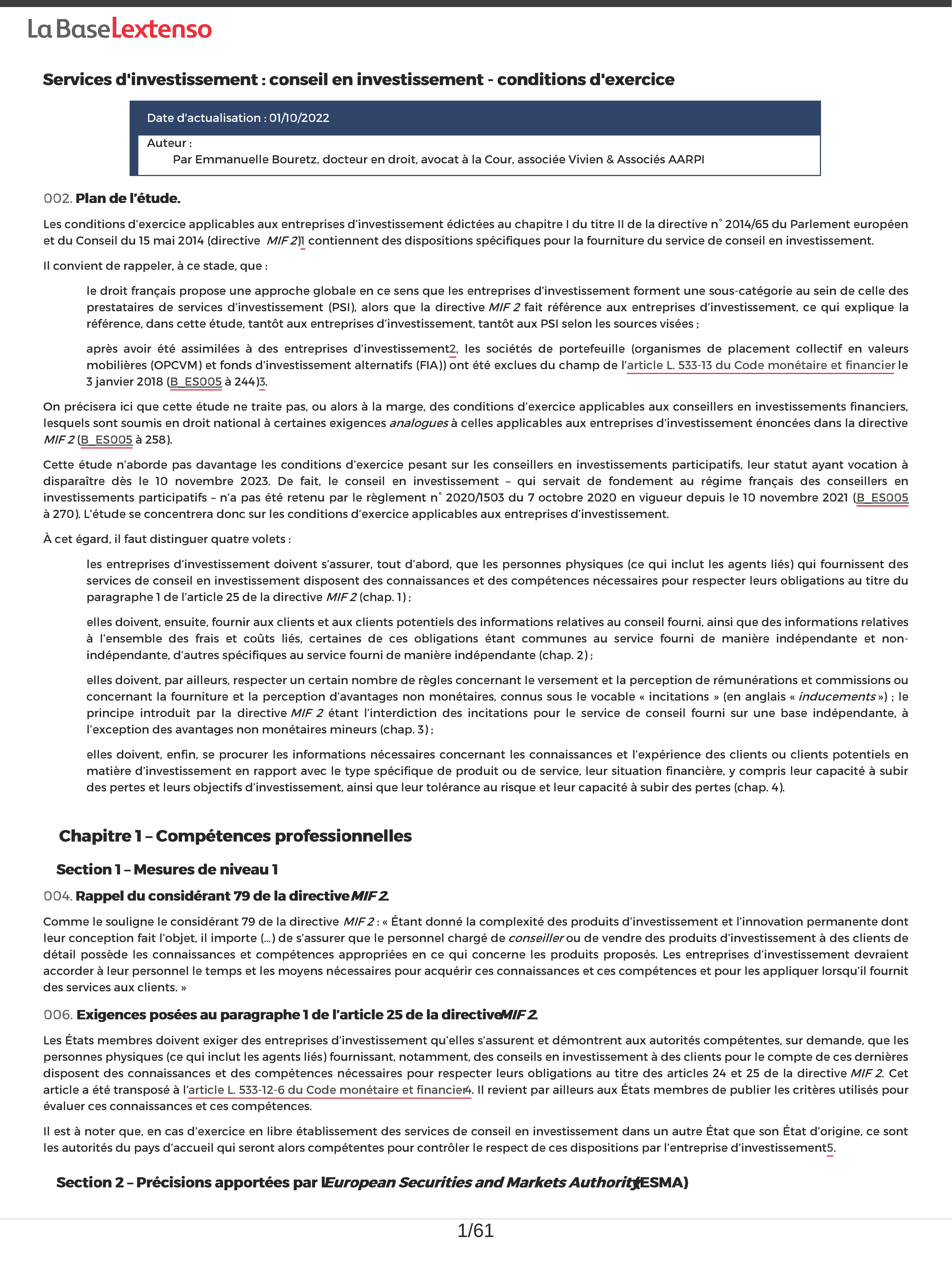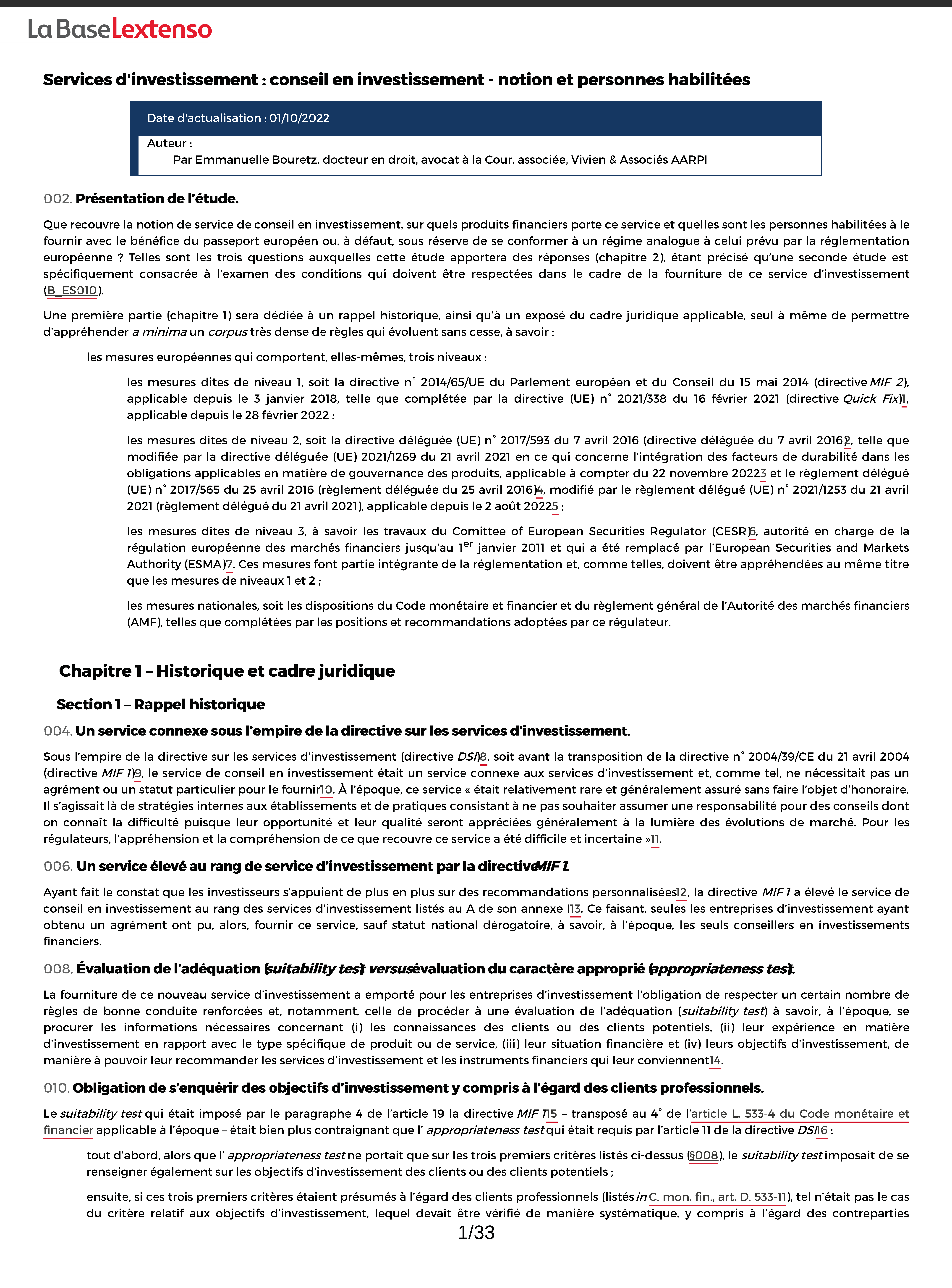 Dans une première étude, Emmanuelle Bouretz détaille la notion de service de conseil en investissement, sur quels produits financiers porte ce service et quelles sont les personnes habilitées à le fournir. Téléchargez ici la 1ère page de l’étude.